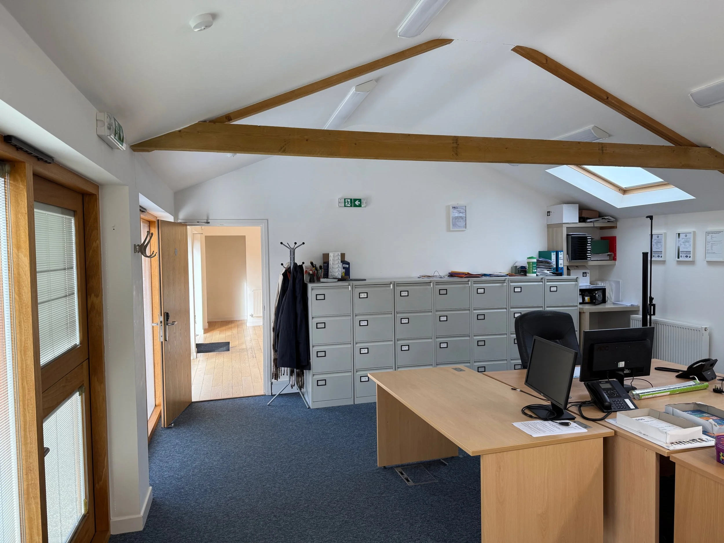 Light and airy open plan office suitable for 4 to 5 people with adjoining private office suitable for 2 people or a meeting room. Views to west of east courtyard. Licence Agreement or lease £1,600 + VAT pcm inclusive of wifi, water, electricity, heating, etc. The adjacent office, which is suitable for a further 4 people, is also available if required.